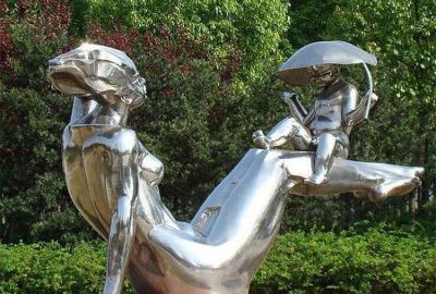 純銅母子雕塑一米六左右,瘦瘦的,扎著個馬尾。鑄造母子雕塑找了個我右手邊的另外一排的位置坐下后,就把女的抱著坐在他大腿上,一邊玩著她的馬尾,一邊和她輕輕地說說笑笑。而純銅母子雕塑則時不時摸摸男人的頭,或笑或嗔。母子雕塑用右眼余光乜著他們,暗暗感嘆真恩愛。